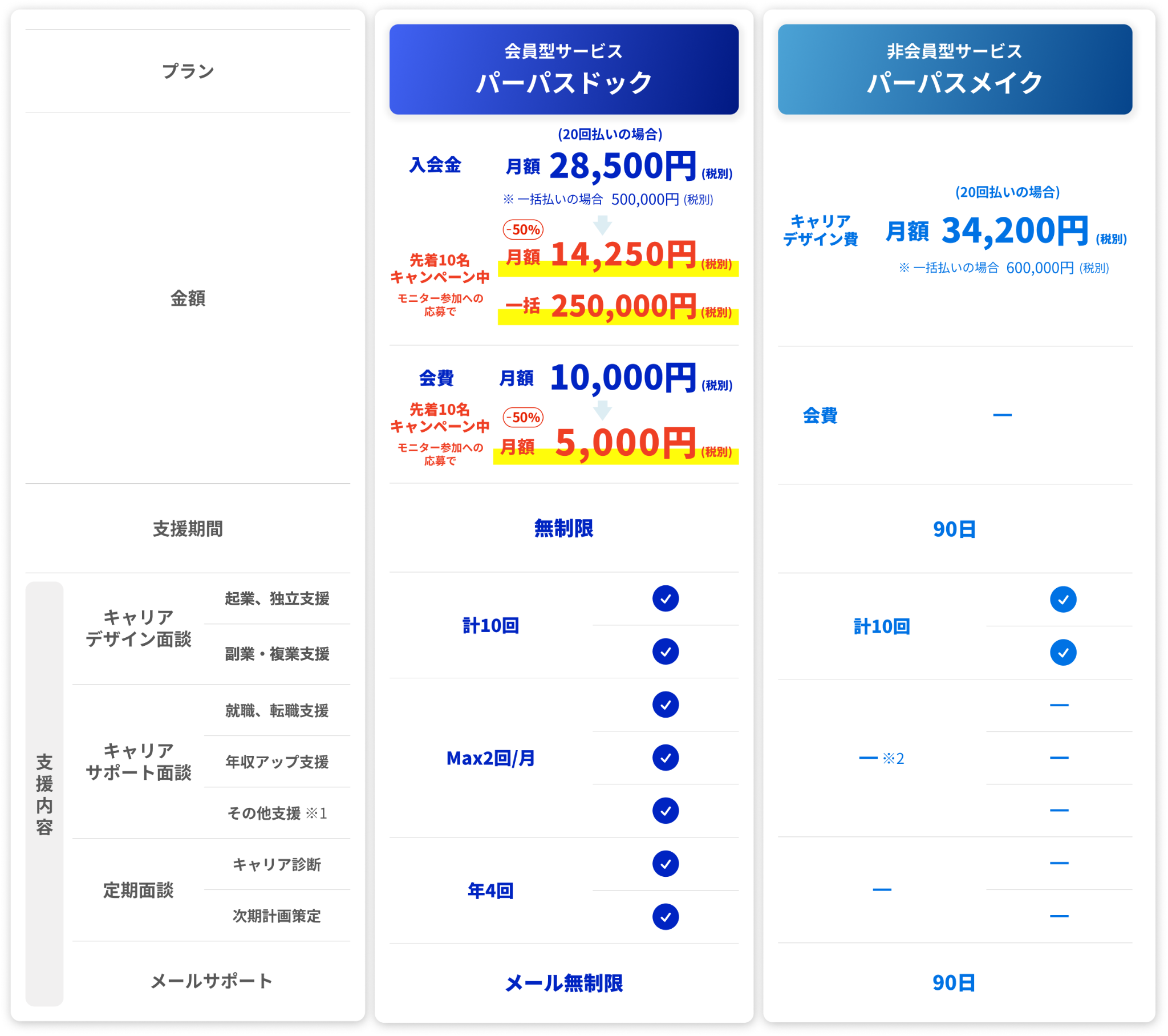 *2 パーパスメイクの支援期間終了後に、キャリアサポート面談をご希望の場合は1セッション20,000円でご利用いただけます